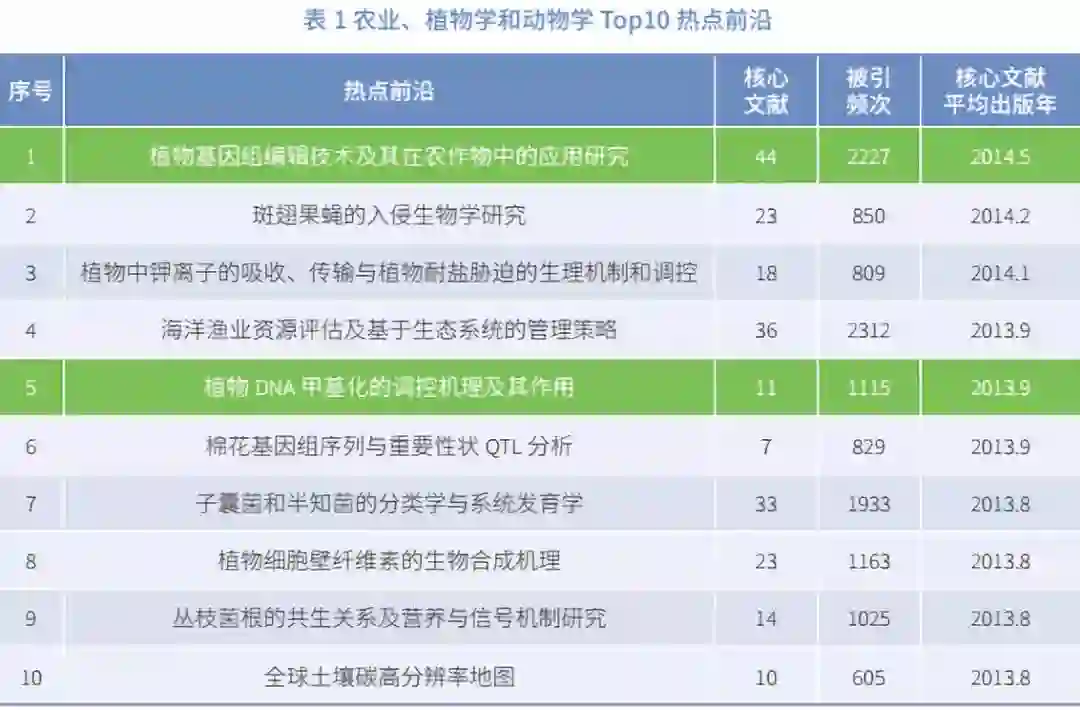 至于100个热点前沿,则更加细化。比如在农业、植物学和动物学领域,2017年的十大热点前沿是: