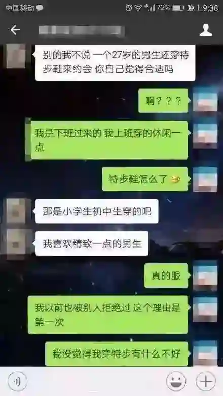 单纯一个手机,用苹果的、用三星的、用华为的、用小米的、用Oppo的就能互相瞧不起,在各大论坛吵个昏天黑地。如果再牵扯到性别等其他因素,那就更热闹了,比如网上流传的“阿里程序员穿特步相亲被拒绝”、“我可以踩在AJ上亲你吗?”的梗被炒热,就是消费观念不同的人产生了隔阂甚至矛盾冲突,以性别矛盾为表象爆发出来。