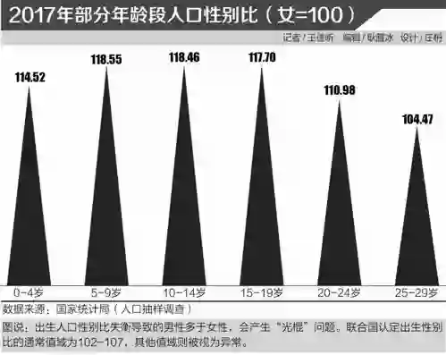 所谓“婚姻挤压”,即由于出生人口性别比失衡导致男性多于女性,从而产生“光棍”问题。国家统计局人口抽样调查的数据显示,2017年25-29岁性别比为104.47(女=100,下同),20-24岁为110.98,15-19岁为117.70。而联合国认定出生性别比的通常值域为102-107,其他值域则被视为异常。