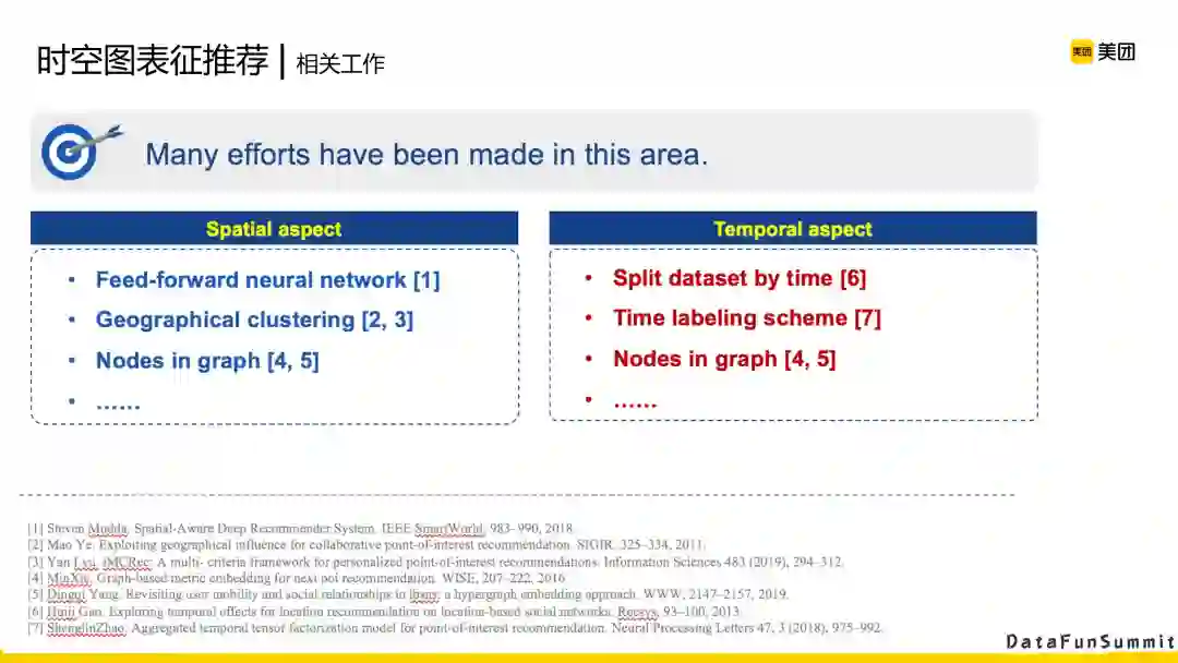 空间相关的工作,有把整个大图按照空间做划分,或者把空间当作时间的节点。时间上面的工作,是把大图按照时间分成几个组,独立地训练。或者把时间当作节点的特征,或者把时间当做一个独立的节点,在图上面做表示。缺乏一个把时间和空间联合起来进行建模的有效方案。