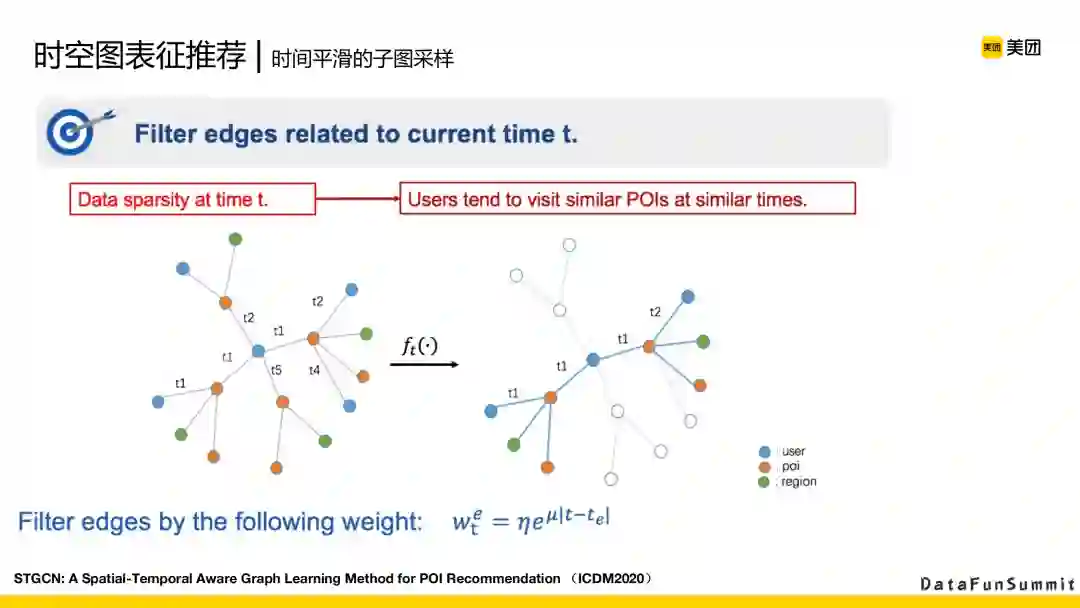 采样部分,我们构造出来是一个多图,一个用户可能在多个时间段都对同一个POI进行了访问。首先,我们会以时间作为因子,去对全图进行一个子图的采样。每条边采样的权重,是根据当前采样的时间节点,以时间偏差作为采样的因子。上图中的公式代表与目标的时间相差越小,也就是距离这个时间越近的一条边,被采选的概率会越大。这样就可以解决有一些边上交互起来比较稀疏的一个问题,使得采样出来的数量比较平滑。
