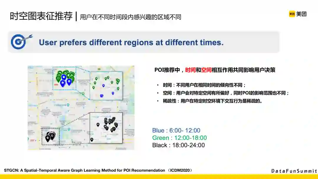 POI推荐里面时间和空间其实是相互作用的,共同影响着用户的决策。左边这张图,不同的颜色表示用户在不同时间段对区域的一些偏好性。蓝色表示的是早上6点到12点的用户偏好,绿色表示的是用户在下午的偏好,晚上则是用黑色来表示。首先,从时间上,可以看到不同用户在相同时间的倾向性不同。然后,从空间上,用户会对特定空间有所偏好,同时POI的影响范围也不同。再看稀疏性,用户在特定时空环境下交互行为是稀疏的。比如像早上蓝色时间段,倾向的POI数量是比较少的,而晚上和下午则相对比较稠密。