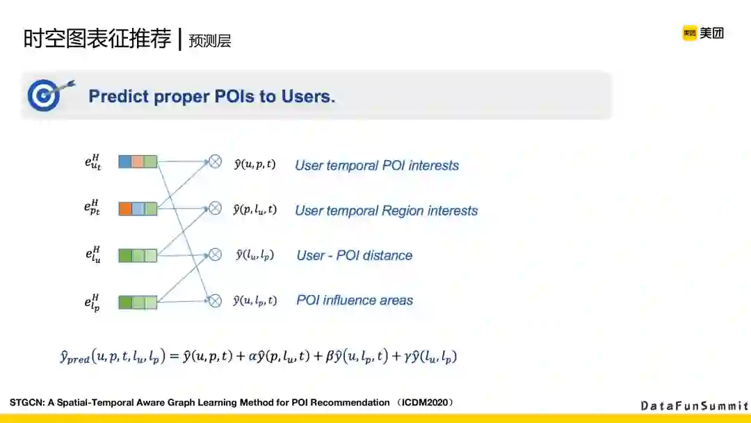 首先是在t这个时刻,用户对POI的兴趣。然后是在这一时刻,用户对区域的兴趣。还有在这个时刻下用户与POI所在区域的距离,以及这些区域对POI的从属。我们还会有一个加权的系数。