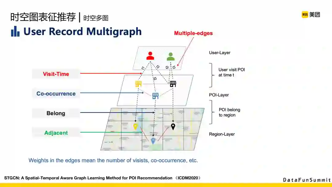 A:第一个问题,这边可能想问的是刚才“时空多图”这个地方吧?首先我们这里的多图并不是指多关系,而是指用户在不同的时间段里面都访问这个POI,每一个时间段一个访问,我们可能会构出一条边来。这边的访问已经结合了我们可能会给不同的交互一个不同的权重,形成同一种关系。比如可能点击行为,给了权重是一,下单可能是三,支付可能是五,这样多关系做一个聚合。