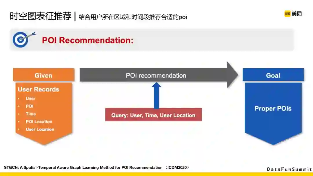 综合来看,我们要做时空的推荐,应该结合用户所在的区域和时间段进行推荐。上下文场景是对于用户在某个时间段我们给他推一些候选POI,然后由候选POI的位置,以及用户所在的位置,在这种情况下我们怎么结合上下文给用户推荐到合适的POI,是我们建模要解决的。