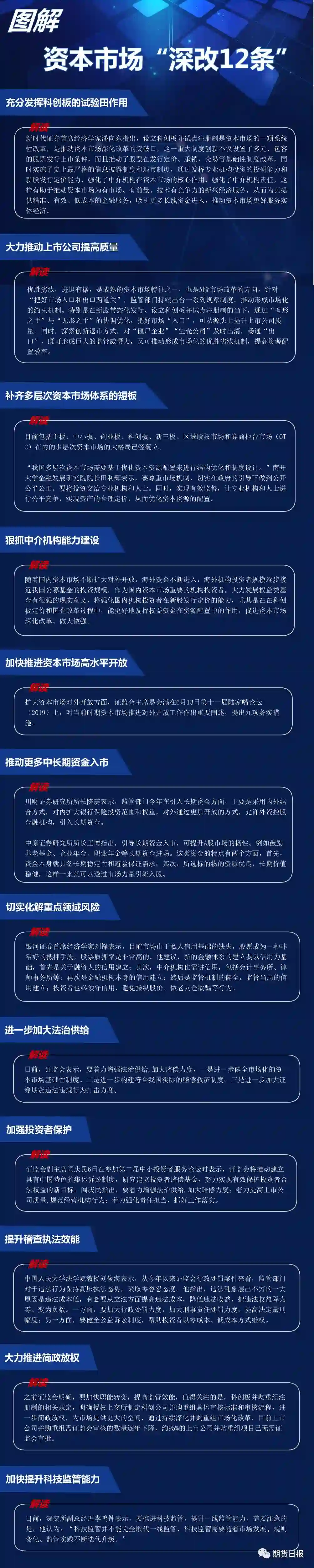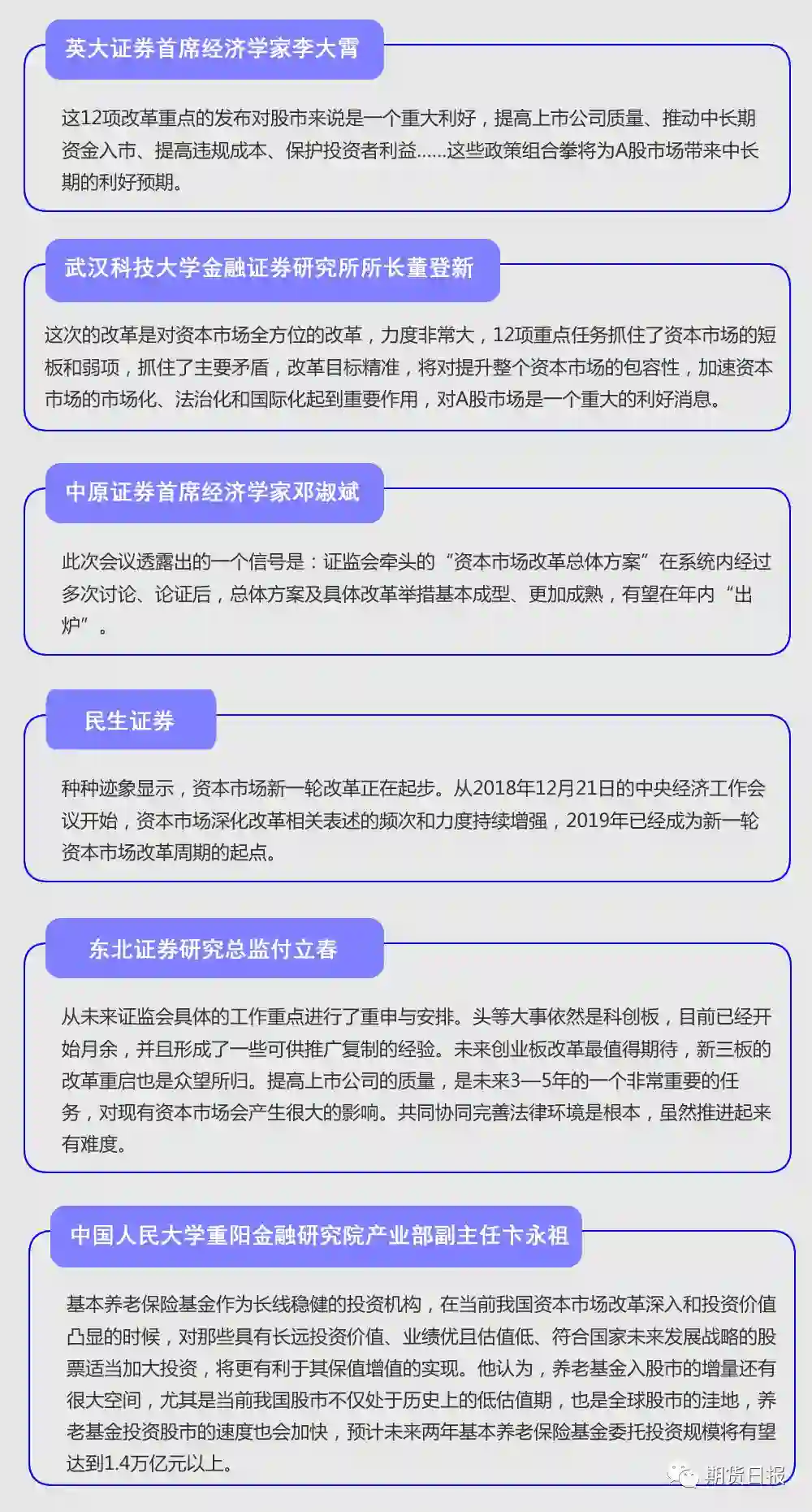 英大证券首席经济学家李大霄认为,这12项改革重点的发布对股市来说是一个重大利好,提高上市公司质量、推动中长期资金入市、提高违规成本、保护投资者利益……这些政策组合拳将为A股市场带来中长期的利好预期。