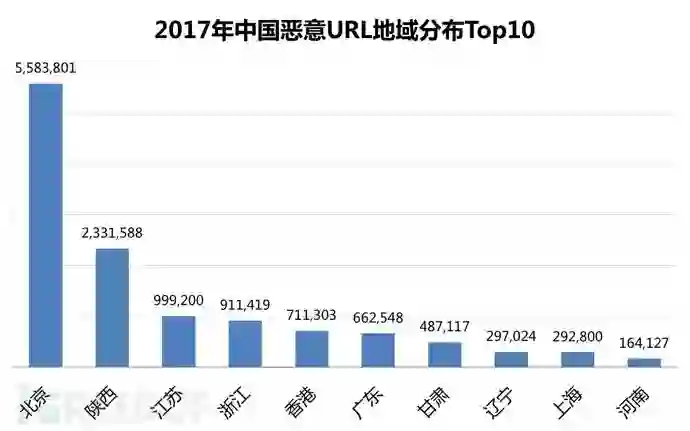 报告期内,北京市恶意网址(URL)总量为558万个,位列全国第一,其次是陕西省233万个,以及江苏省100万个,分别为二、三位。