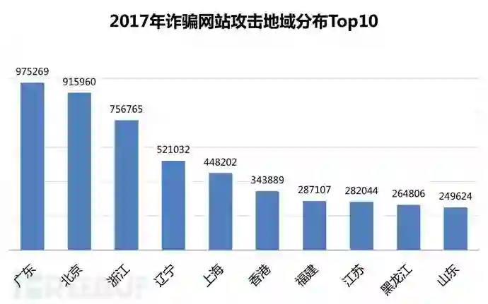 2017年瑞星“云安全”系统共拦截诈骗网站攻击740万余次,广东受诈骗网站攻击97万次,位列第一位,其次是北京市受诈骗网站攻击92万次,第三名是浙江省受诈骗网站攻击75万次。