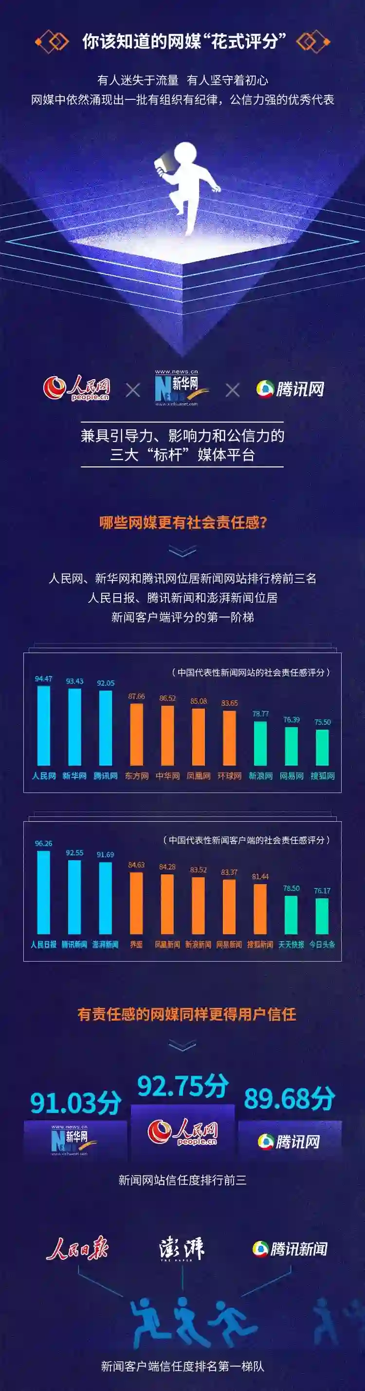 在不久前,工信部情报所网络舆情研究中心发布了一份《2017中国网络媒体公信力调查报告》,通过用户信任度、社会责任感、覆盖率、影响力及媒体满意度五大维度对网络媒体公信力进行了分析和排名。报告显示,在各个指标中排名处于第一梯队的是人民网、人民日报客户端、新华网、腾讯网和腾讯新闻客户端。其中,在用户信任度和社会责任感方面,排名前三的新闻客户端是人民日报、腾讯新闻与澎湃新闻,人民日报分别以96.46分和96.26的得分高居榜首位置;新闻网站前三名则是人民网、新华网和腾讯网。在媒体满意度方面,人民日报依然以93.33的得分位居第一,腾讯新闻和澎湃新闻位居第二、三位。
