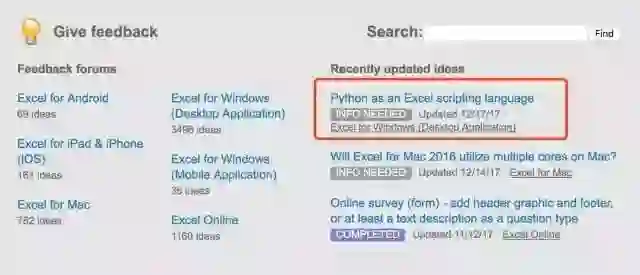 微软在上个月开启了一个针对 Excel 功能的话题,用以收集用户的反馈。随后有用户提议让 Python 成为 Excel 的一种脚本语言,不仅可以作为 VBA 的替代品,而且也可以作为字段函数(= SUM(A1:A2))的替代方案。该提议得到了众多用户的支持,得票支持率高于排名第二的提议的两倍。