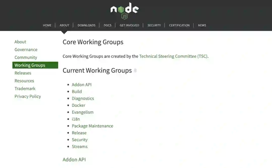 工作组由 Technical Steering Committee (TSC) 创建,当前一共有 10 个工作组。