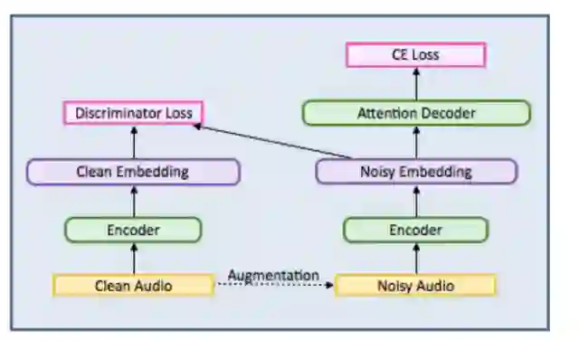 本论文中,研究者使用生成对抗网络(GAN)框架,以可扩展、端到端的方式提高序列到序列模型的鲁棒性。编码器组件作为 GAN 的生成器,训练以输出噪声音频样本和干净音频样本之间不可分辨的嵌入。由于没有限制假设,这种新型鲁棒训练方法理论上能够在没有对齐或复杂的推断流程,甚至没有增强的情况下提高鲁棒性。研究者还使用编码器距离目标函数进行实验,以明确限制嵌入空间,展示了获取隐藏表征级别的不变性是鲁棒性自动语音识别有前途的方向。