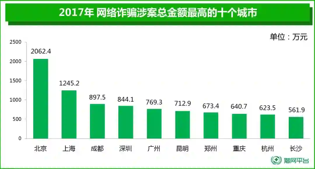从各城市网络诈骗涉案总金额来看,北京以2062.4万元位居榜首,其次上海(1245.2万元)、成都(897.5万元)、深圳(844.1万元)、广州(769.3万元)和昆明(712.9万元)的涉案总金额也在700万元以上。