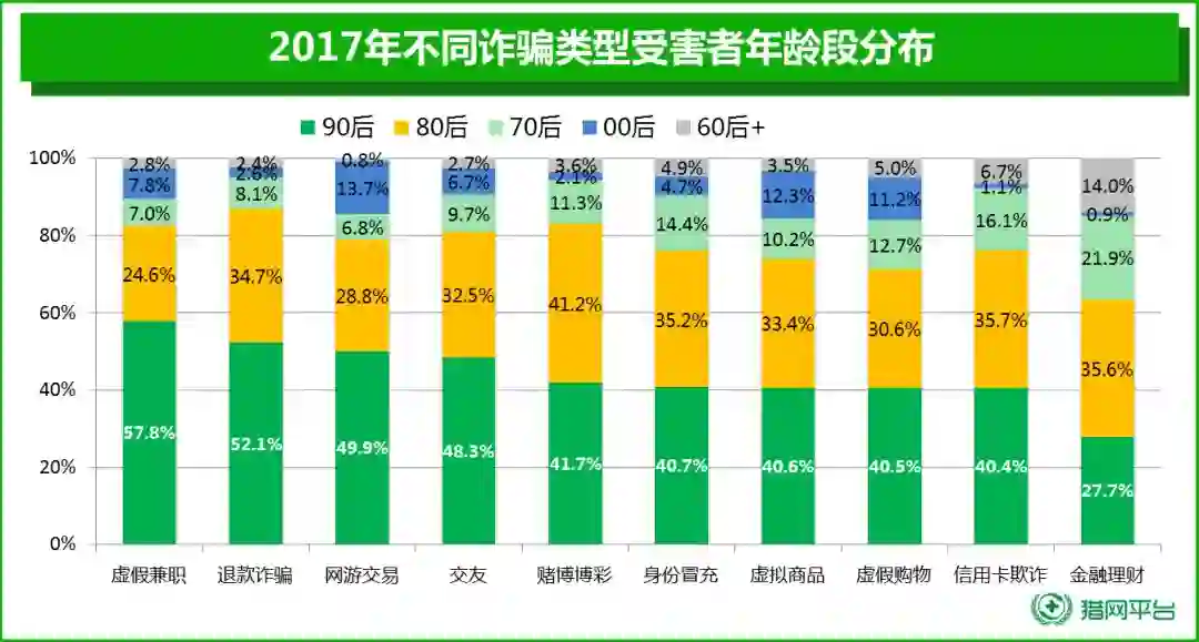 下图给出了不同类型的网络诈骗受害者的年龄段分布情况。从图中我们同样可以看出,在网络兼职和退款诈骗的受害者中,一半以上为90后。其他诈骗类型中,90后也是诈骗的主要群体。事实上,90后年轻人刚踏入社会,或初涉职场,在职业方面尚缺少基本的安全防范知识,所以也最容易调入虚假兼职这种看似挣钱轻松,挣钱快的网络诈骗陷阱中。
