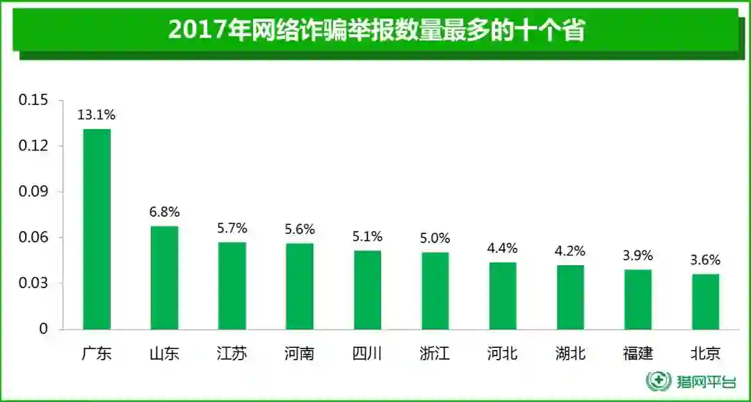 从用户举报情况来看,广东(13.1%)、山东(6.8%)、江苏(5.7%)、河南(5.6%)、四川(5.1%)、浙江(5.0%)这6个省级行政区的举报网络诈骗用户最多。举报数量约占到了全国用户举报总量的41.4%。