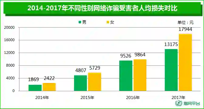 从受害者人均经济损失来看:2017年,男性受害者人均损失较2016年增长了38.3%;而女性受害者人均损失较2016年增长81.9%,可见女性受害者人均损失大幅升高。