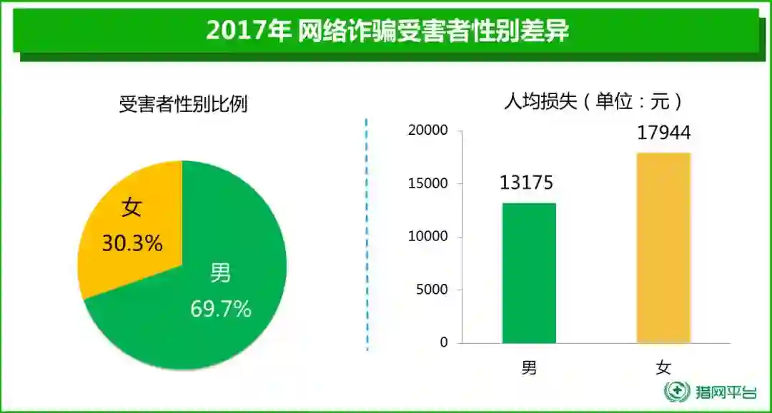 从举报用户的性别差异来看,男性受害者占69.7%,女性占30.3%,男性受害者占比大大高于女性。但从人均损失来看,男性为13175元,女性为17944元。可见在网络生活中,女性的上当几率其实要比男性低得多,可女性一旦相信了骗子,往往会比男性付出更大的代价。