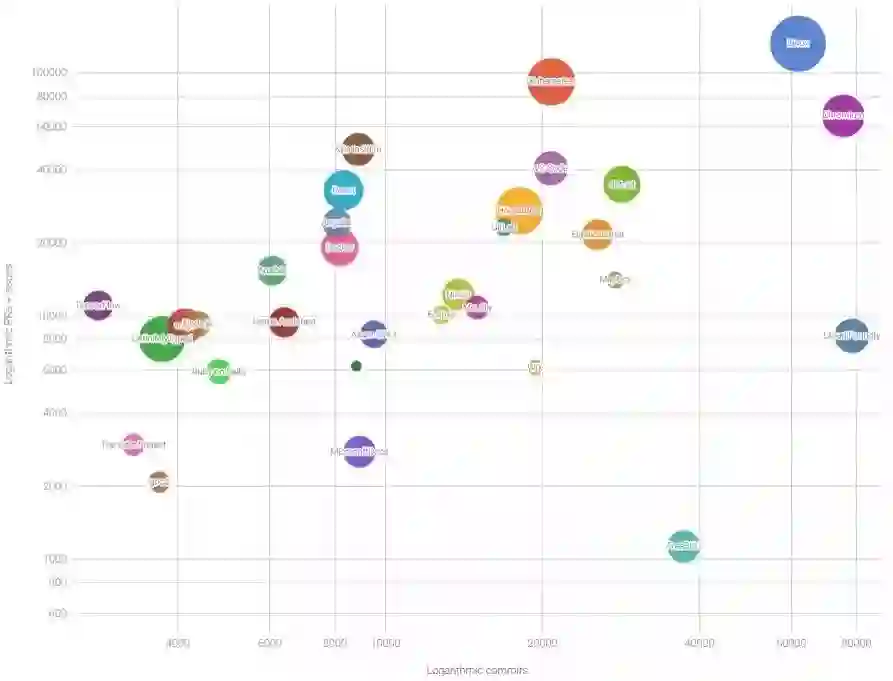 这是一个气泡图,Y轴绘制了每个项目的issues以及pull requests的数量,X轴则绘制了项目成员所完成的提交数量,气泡本身则显示了社区的相对大小。这个大小其实是每个项目中作者数量的平方根,Linux内核在当时以2843个作者居首,紧随其后的是Kubernetes的2380个和Docker的1346个。