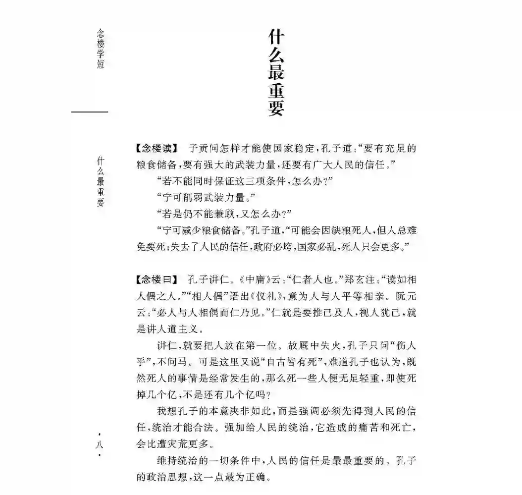 《念楼学短》本书每篇文章的小标题,都蕴含了作者的独特创造与智慧。比如:《论语·颜渊》“子贡问政”这一篇的小标题,就是“什么最重要”。