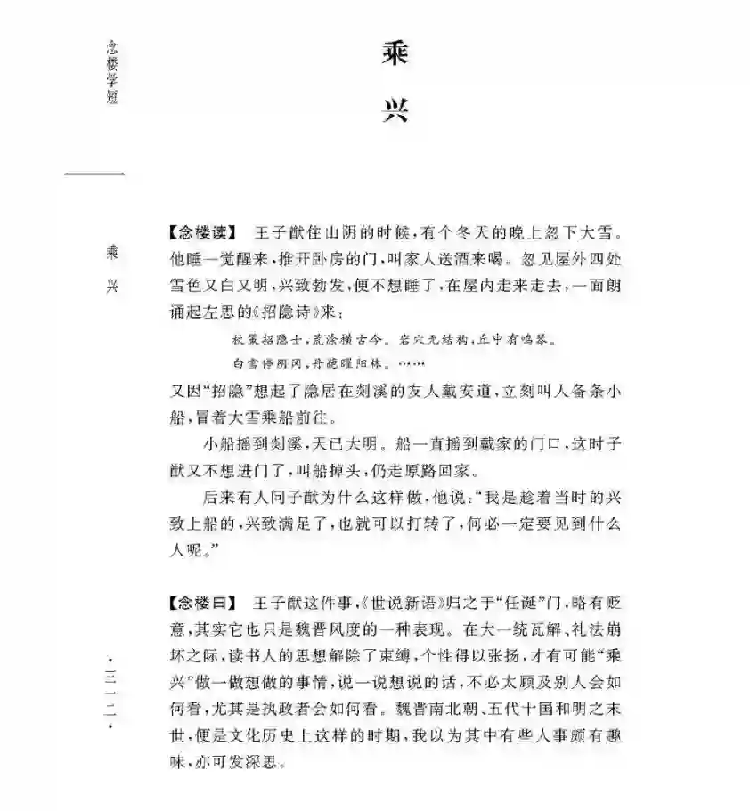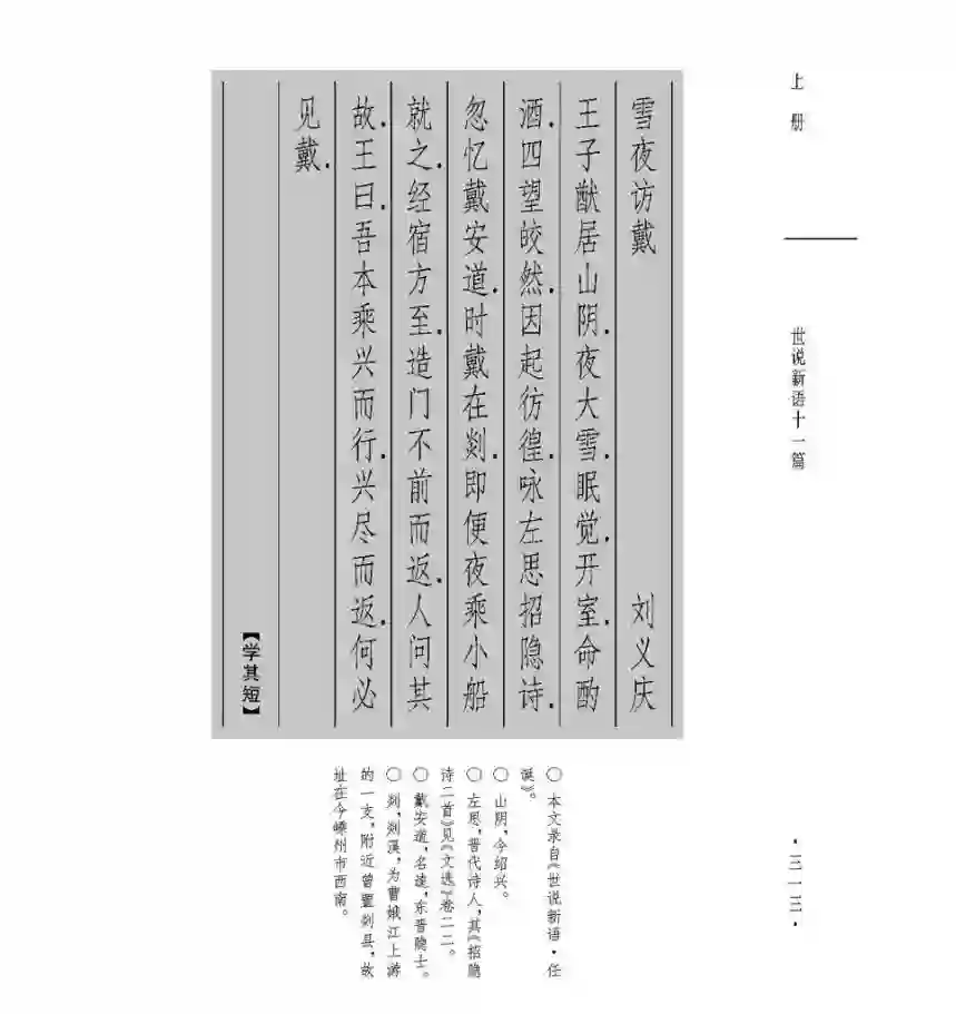 比如选自《世说新语》一书的《雪夜访戴》一篇,就讲述了名士王子猷雪夜访友,乘兴而行,兴尽而返的故事。