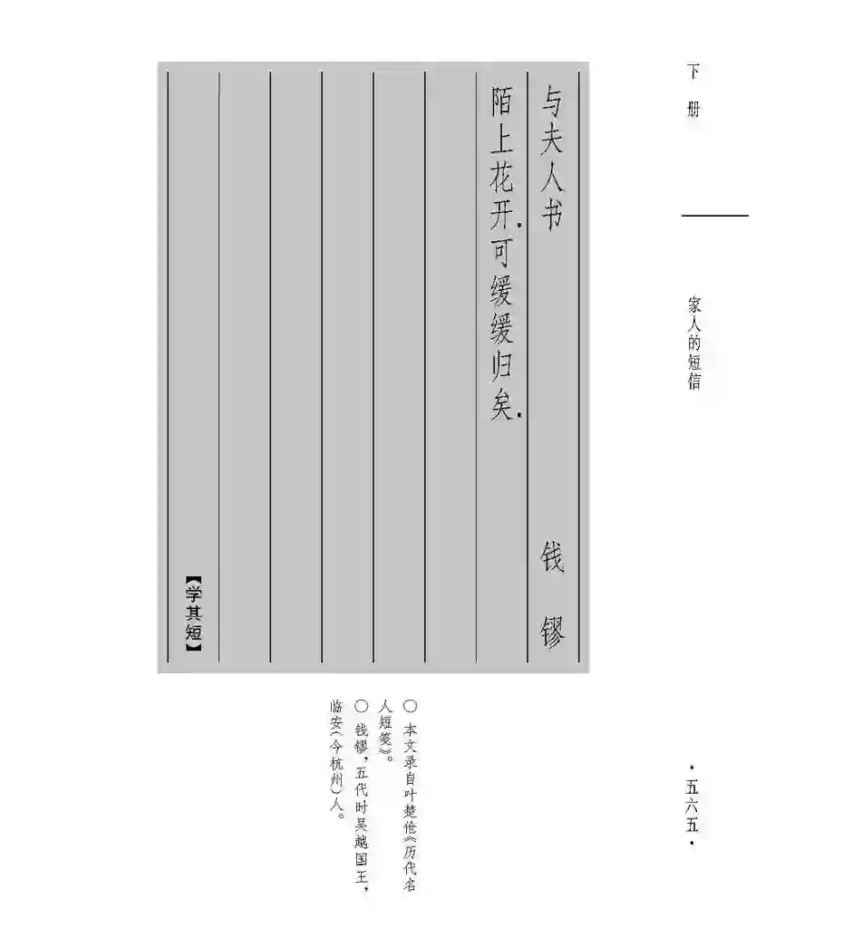 这封信是吴越国王钱镠写给回娘家的夫人,催她快点归来。信只有两句,第一句“陌上花开”,点明此际春光大好,提醒夫人不要辜负大好春光。