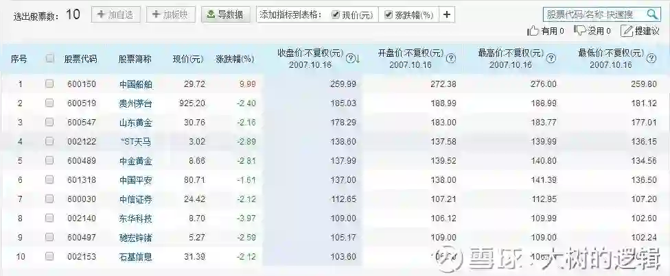 由于2007年业绩牛的推动,产生了共十只100元以上的股票,分别为中国船舶、贵州茅台、山东黄金、*ST天马、中金黄金、中国平安、中信证券、东华科技、驰宏锌储、石基信息,主要以有色等资源股为主。当泡沫结束,就知道谁在裸泳了,于2008年10月28日熊市最低点1664点百元股全部被消灭。