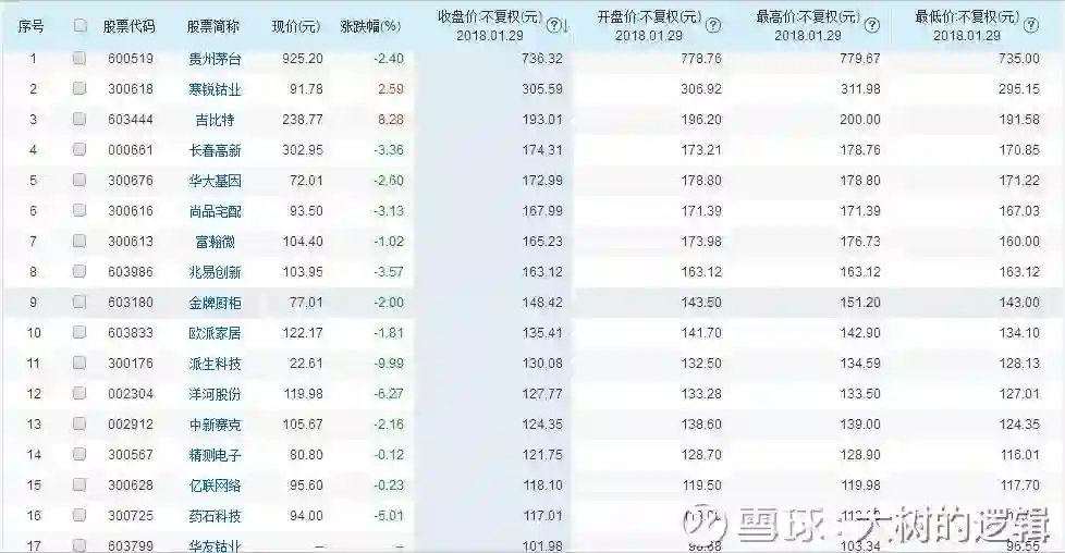 2017年的价值牛又催生了共18只百元股,其中新进了尚品宅配、金牌橱柜、欧派家居等家居类企业,这与2017年家居上市元年脱不了关系,当然了也少不了吉比特、派生科技等概念股、更少不了消费白马贵州茅台。
