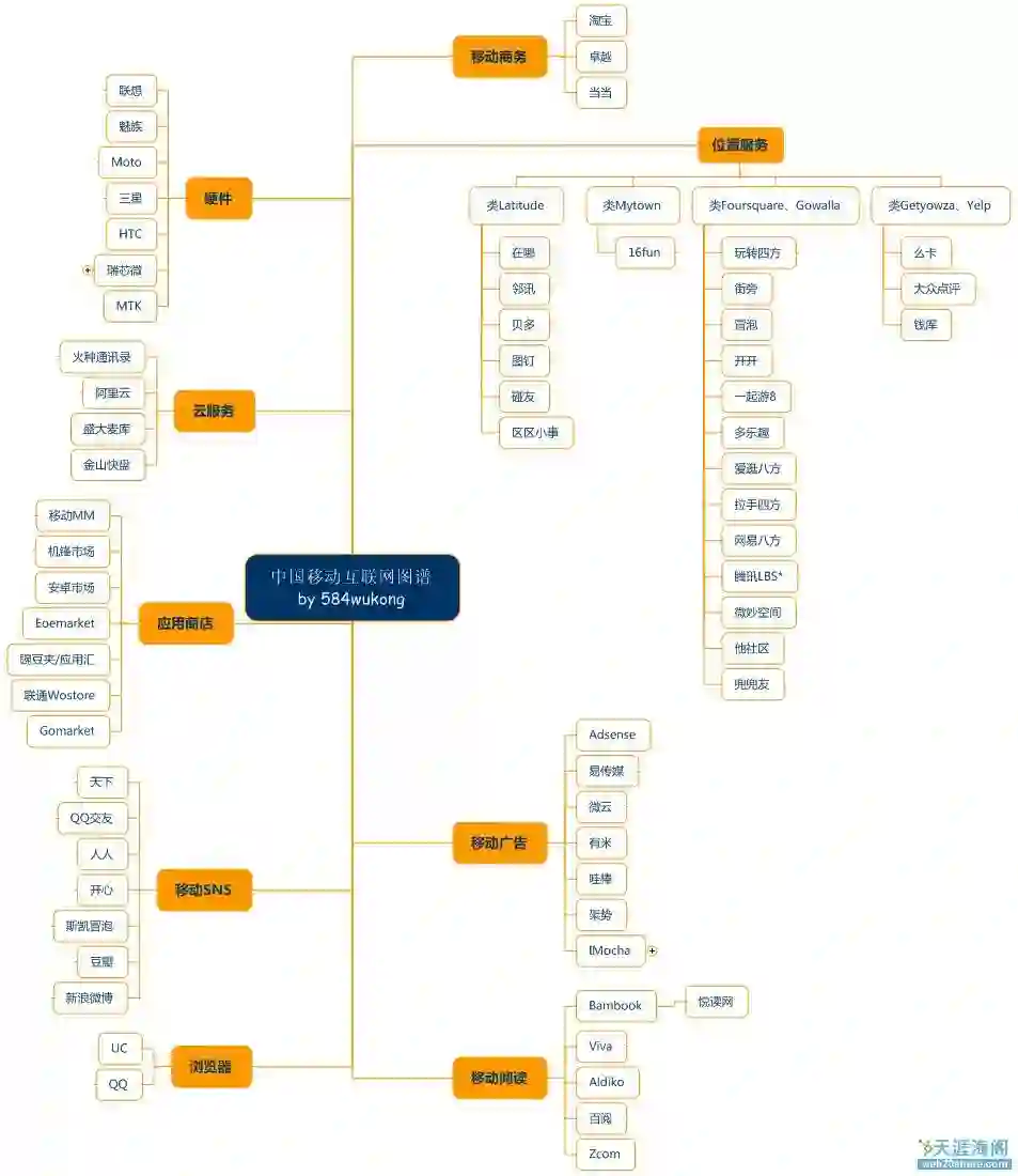 (这张图是早年在移动广告聚合平台果合工作,现在是触控 COO 的好朋友悟空,在当时很棒的个人科技博客---天涯海阁上发布的移动互联网图谱。今天回头看这样一张图可能大家会觉得有些搞笑,但那时候市面上听过名字的项目也就是这些了。)
