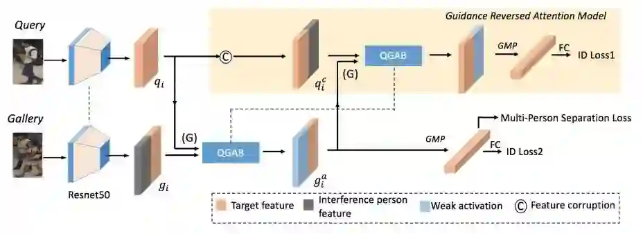 传统的行人重识别假设裁剪的图像只包含单人。然而,在拥挤的场景中,现成的检测器可能会生成多人的边界框,并且其中背景行人占很大比例,或者存在人体遮挡。从这些带有行人干扰的图像中提取的特征可能包含干扰信息,这将导致错误的检索结果。为了解决这一问题,本文提出了一种新的深层网络(PISNet)。PISNet首先利用Query图片引导的注意力模块来增强图片中目标的特征。此外,我们提出了反向注意模块和多人分离损失函数促进了注意力模块来抑制其他行人的干扰。我们的方法在两个新的行人干扰数据集上进行了评估,结果表明,该方法与现有的Re-ID方法相比具有更好的性能。