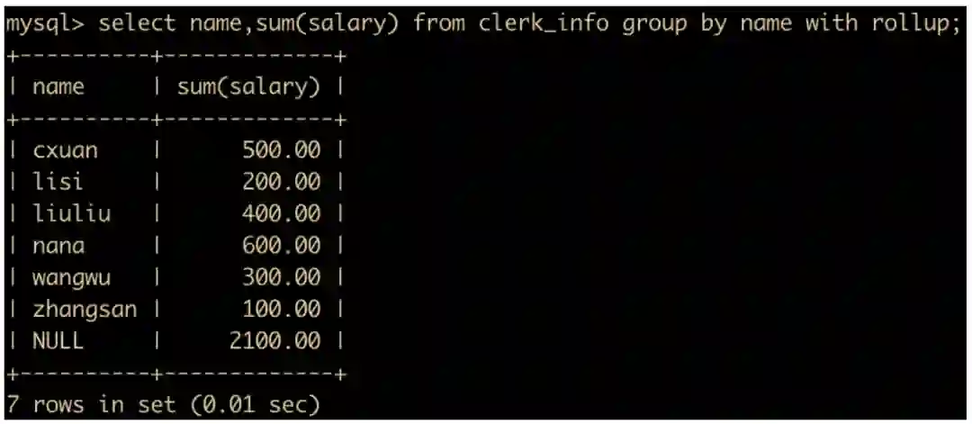select name,sum(salary) from clerk_info group by name with rollup;