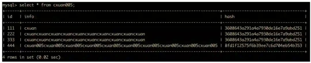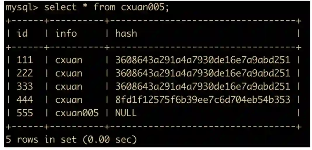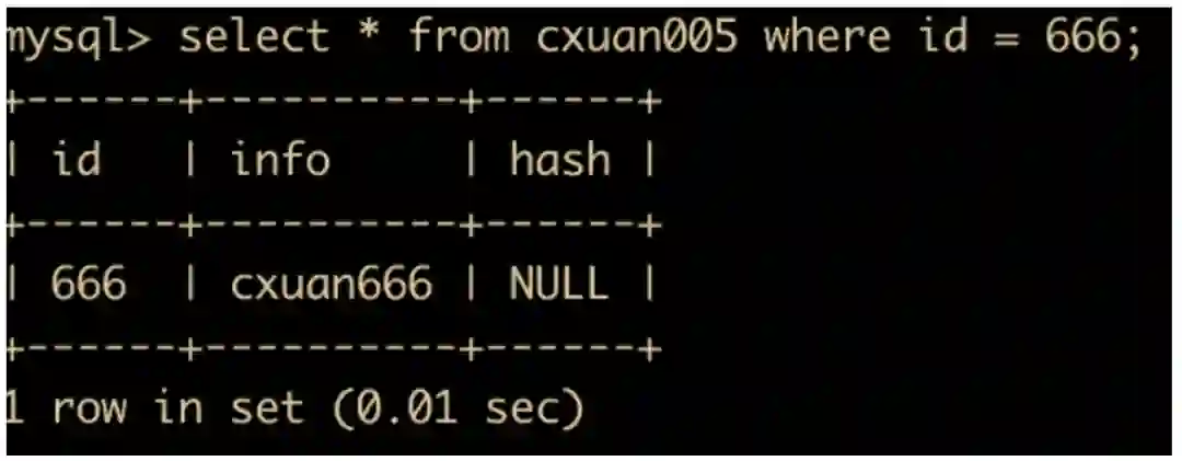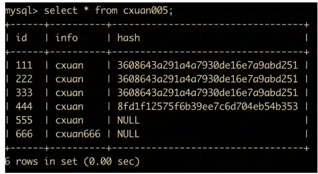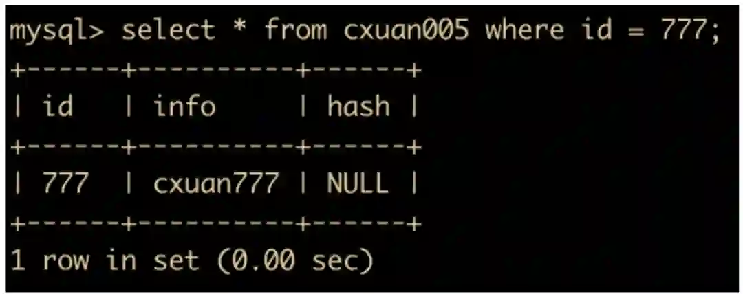 insert into cxuan005(id,info) values (555,'cxuan005'); # 插入一条数据