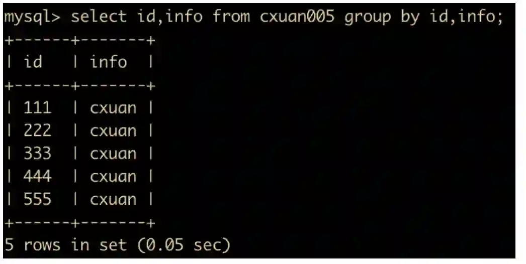 select id,info from cxuan005 group by id,info;