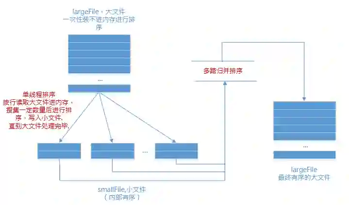 内存极少的情况下,利用分治策略,利用外存保存中间结果,再用多路归并来排序;