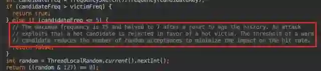 TinyLFU借助了数据流Sketching技术,它可以用小得多的空间存放频次信息。TinyLFU采用了一种基于滑动窗口的时间衰减设计机制,借助于一种简易的 reset 操作:每次添加一条记录到Sketch的时候,都会给一个计数器上加 1,当计数器达到一个尺寸 W 的时候,把所有记录的 Sketch 数值都除以 2,该 reset 操作可以起到衰减的作用 。