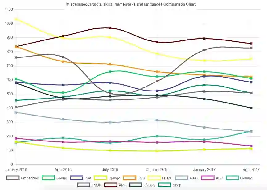 目前在网络应用程序领域的王者似乎是 Javascript。它获得了最大的总数。虽然它的数量保持平坦,这很像 Ruby on Rails,但它已经吸引了更多的观众。平均来说,过去六个季度,公司在分析的 10,000 份工作清单中有 1,500 份需要 Javascript 技能。这比 PHP 或 Ruby on Rails 多了 70%。