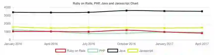 最初打破 PHP 领导地位的是 Ruby on Rails。多年来,我看到公司们和开发者们进行了这一转型。Ruby on Rails 经历了一段时间,在这个时期它是这个领域的首选语言。然而,从我们收集的数字来看,它的光泽似乎已经失去了一点。虽然没有像 PHP 这样的衰退,但其数量一直保持相对平稳,它曾经有过的增长似乎停滞不前。