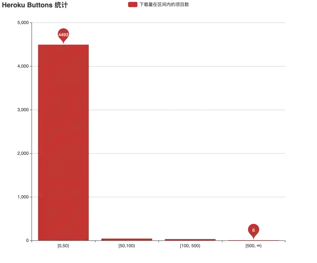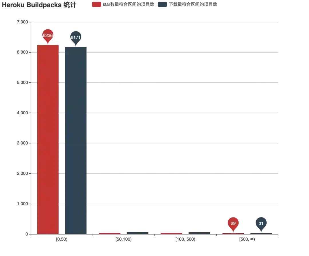 我们可以看到,Buildpack 只能在 Heroku 平台使用,所以 star 数量代表了大家对项目的关心,而下载量则代表了用户的使用频度。图中,6000 多个 Buildpack 的 star 数和下载安装量均在 50 以内,而超过 500 个 star 和 500 次下载部署的项目均只有 30 个左右。再来看 Buttons 中的项目,由于这些项目本身还可以部署到 Heroku 以外的其他平台,所以就只看在 Heroku 的部署下载量反映大家的使用频度,而图中超过 500 次部署的 Buttons 项目只有 6 个。原来这一切竟只是表面繁荣。