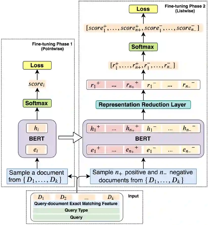 背景提高机器阅读理解(MRC)能力以及开放领域问答(QA)能力是自然语言处理(NLP)领域的一大重要目标。在人工智能领域,很多突破性的进展都基于一些大型公开的数据集。比如在计算机视觉领域,基于对ImageNet数据集研发的物体分类模型已经超越了人类的表现。类似的,在语音识别领域,一些大型的语音数据库,同样使得了深度学习模型大幅提高了语音识别的能力。近年来,为了提高模型的自然语言理解能力,越来越多的MRC和QA数据集开始涌现。但是,这些数据集或多或少存在一些缺陷,比如数据量不够、依赖人工构造Query等。针对这些问题,微软提出了一个基于大规模真实场景数据的阅读理解数据集MS MARCO (Microsoft Machine Reading Comprehension)[1]。该数据集基于Bing搜索引擎和Cortana智能助手中的真实搜索查询产生,包含100万查询,800万文档和18万人工编辑的答案。基于MS MARCO数据集,微软提出了两种不同的任务:一种是给定问题,检索所有数据集中的文档并进行排序,属于文档检索和排序任务;另一种是根据问题和给定的相关文档生成答案,属于QA任务。在美团业务中,文档检索和排序算法在搜索、广告、推荐等场景中都有着广泛的应用。此外,直接在所有候选文档上进行QA任务的时间消耗是无法接受的,QA任务必须依靠排序任务筛选出排名靠前的文档,而排序算法的性能直接影响到QA任务的表现。基于上述原因,我们主要将精力放在基于MS MARCO的文档检索和排序任务上。自2018年10月MACRO文档排序任务发布后,迄今吸引了包括阿里巴巴达摩院、Facebook、微软、卡内基梅隆大学、清华等多家企业和高校的参与。在美团的预训练MT-BERT平台[14]上,我们提出了一种针对该文本检索任务的BERT算法方案,称之为DR-BERT(Enhancing BERT-based Document Ranking Model with Task-adaptive Training and OOV Matching Method)。DR-BERT是第一个在官方评测指标MRR@10上突破0.4的模型,且在2020年5月21日(模型提交日)-8月12日期间位居榜首,主办方也单独发表推文表示了祝贺,如下图1所示。DR-BERT模型的核心创新主要包括领域自适应的预训练、两阶段模型精调及两种OOV(Out of Vocabulary)匹配方法。图1 官方祝贺推文及MARCO 排行榜相关介绍Learning to Rank在信息检索领域,早期就已经存在很多机器学习排序模型(Learning to Rank)用来解决文档排序问题,包括LambdaRank[2]、AdaRank[3]等,这些模型依赖很多手工构造的特征。而随着深度学习技术在机器学习领域的流行,研究人员提出了很多神经排序模型,比如DSSM[4]、KNRM[5]等。这些模型将问题和文档的表示映射到连续的向量空间中,然后通过神经网络来计算它们的相似度,从而避免了繁琐的手工特征构建。图2 Pointwise、Pairwise、Listwise训练的目标根据学习目标的不同,排序模型大体可以分为Pointwise、Pairwise和Listwise。这三种方法的示意图如上图2所示。其中,Pointwise方法直接预测每个文档和问题的相关分数,尽管这种方法很容易实现,然而对于排序来说,更重要的是学到不同文档之间的排序关系。基于这种思想,Pairwise方法将排序问题转换为对两两文档的比较。具体来讲,给定一个问题,每个文档都会和其他的文档两两比较,判断该文档是否优于其他文档。这样的话,模型就学习到了不同文档之间的相对关系。然而,Pairwise的排序任务存在两个问题:第一,这种方法优化两两文档的比较而非更多文档的排序,跟文档排序的目标不同;第二,随机从文档中抽取Pair容易造成训练数据偏置的问题。为了弥补这些问题,Listwise方法将Pairwsie的思路加以延伸,直接学习排序之间的相互关系。根据使用的损失函数形式,研究人员提出了多种不同的Listwise模型。比如,ListNet[6]直接使用每个文档的top-1概率分布作为排序列表,并使用交叉熵损失来优化。ListMLE[7]使用最大似然来优化。SoftRank[8]直接使用NDCG这种排序的度量指标来进行优化。大多数研究表明,相比于Pointwise和Pairwise方法,Listwise的学习方式能够产生更好的排序结果。BERT自2018年谷歌的BERT[9]的提出以来,预训练语言模型在自然语言处理领域取得了很大的成功,在多种NLP任务上取得了SOTA效果。BERT本质上是一个基于Transformer架构的编码器,其取得成功的关键因素是利用多层Transoformer中的自注意力机制(Self-Attention)提取不同层次的语义特征,具有很强的语义表征能力。如图3所示,BERT的训练分为两部分,一部分是基于大规模语料上的预训练(Pre-training),一部分是在特定任务上的微调(Fine-tuning)。图3 BERT的结构和训练模式在信息检索领域,很多研究人员也开始使用BERT来完成排序任务。比如,[10][11]就使用BERT在MS MARCO上进行实验,得到的结果大幅超越了当时最好的神经网络排序模型。[10]使用了Pointwise学习方式,而[11]使用了Pairwise学习方式。这些工作虽然取得了不错的效果,但是未利用到排序本身的比较信息。基于此,我们结合BERT本身的语义表征能力和Listwise排序,取得了很大的进步。模型介绍任务描述
