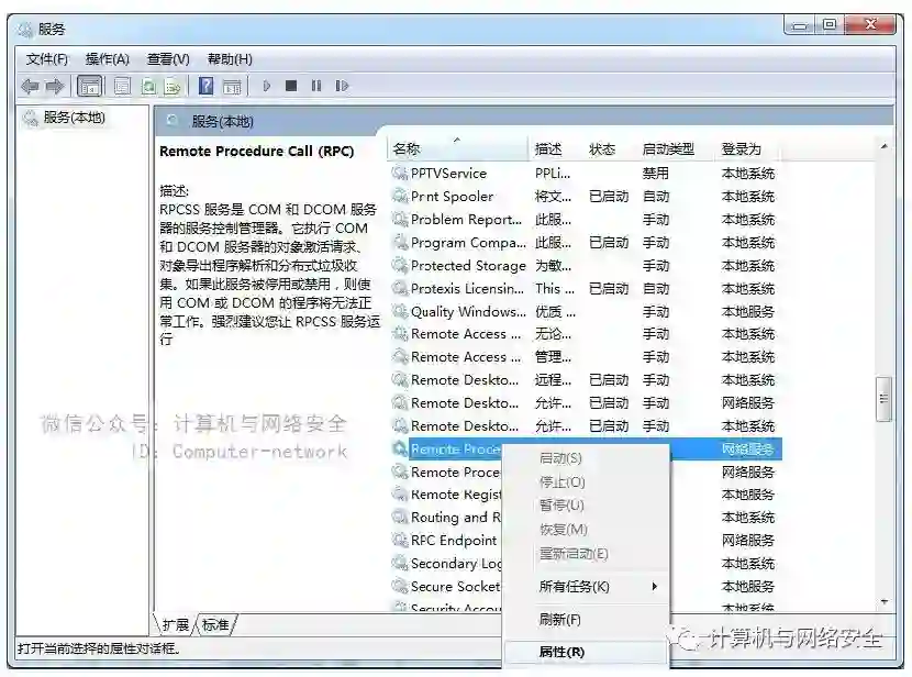 步骤1:在“管理工具”窗口中双击“服务”图标,即可打开“服务”窗口。在其中可以看到本机中所有的服务,如图10所示。在“服务”列表中右击Remote Proceduce Call(RPC)服务,在快捷菜单中选择“属性”选项,即可打开“Remote Proceduce Call(RPC)的属性(本地计算机)”对话框。