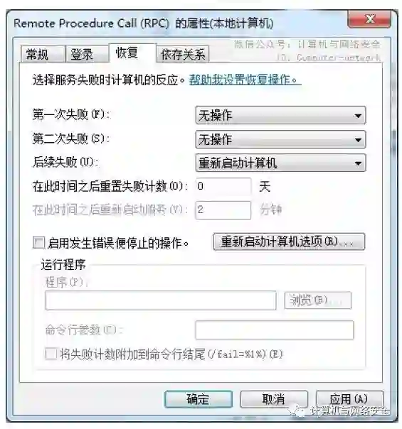 步骤2:切换到“恢复”选项卡,将其中的“第一失败”、“第二次失败”以及“后续失败”都设置为“无操作”选项,如图11所示。