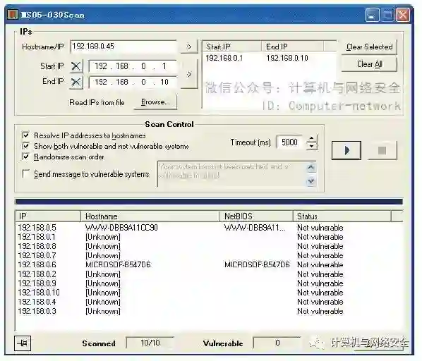 步骤2:单击Scan按钮,即可开始扫描,如图9所示。如果在设置的IP范围中有存在RPC漏洞的主机,则该主机的详细信息将出现在扫描结果中。