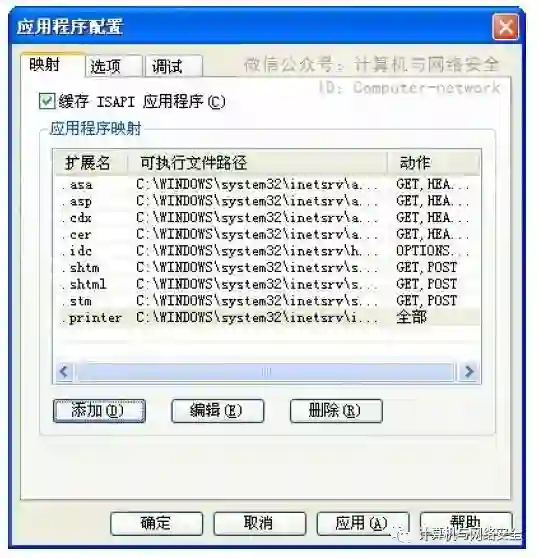 步骤3:在“主目录”选项卡中单击“配置”按钮,即可打开“应用程序配置”对话框,如图7所示。在“应用程序映射”列表中找到.printer映射后直接删除就可以了。