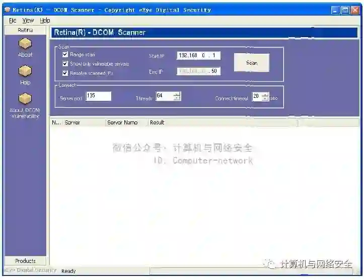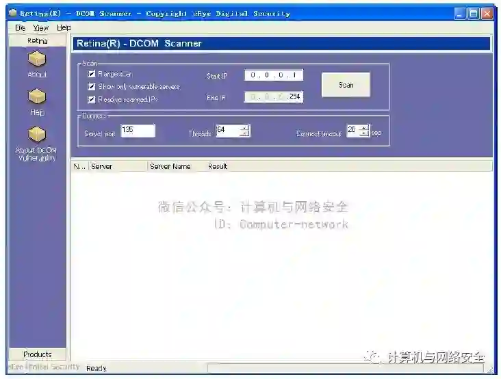 检测这类漏洞可使用RPC漏洞专用扫描器Retina(R)–DCOM Scanner。它是eEye安全公司针对微软MS03-026以及最新MS03-039 RPC DCOM漏洞设计的扫描工具。
