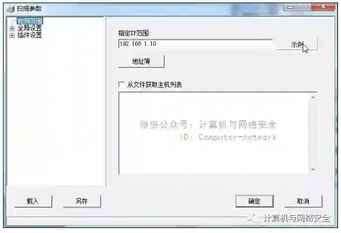 步骤2:在X-scan主窗口中选择“设置”→“扫描参数”菜单项或单击工具栏中的按钮,即可打开“扫描参数”窗口。在其中可以输入目标主机IP地址的扫描范围,也可以输入IP段,如图3所示。