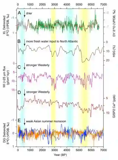 去趋势后的陕南石笋氧同位素记录(A)、和北大西洋冰飘碎屑(B)、西风(C、D)以及夏季风强度记录(E)的对比