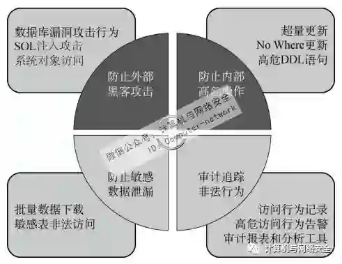 4)建立完善的数据库日志审计机制,通过数据库审计技术实现数据库的全面精确记录,配合相应的审计管理,构建风险状况、运行状态、性能参数和语句分布的实时监控和定期审计评估能力,及时发现、溯源和处置安全风险。