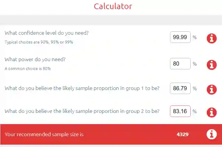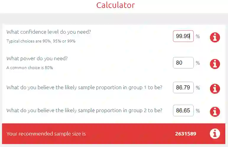第一名和第二名的分数差距是0.0014,我们把它放到样本容量计算器里。