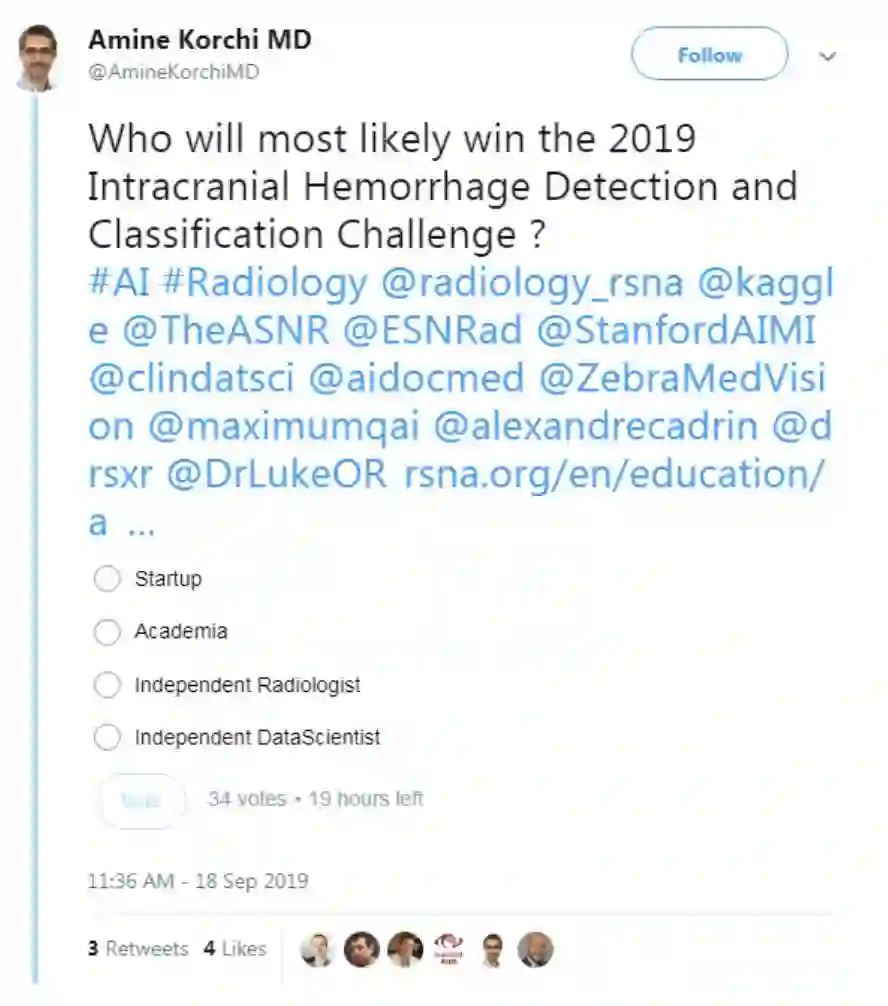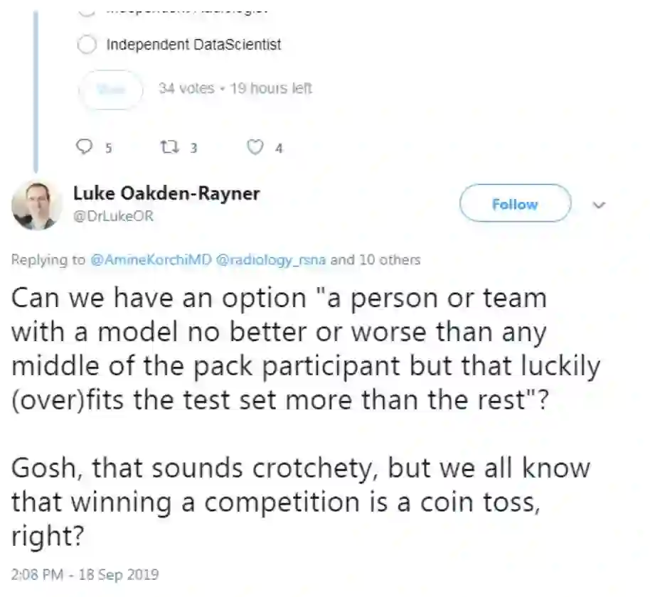 围绕该数据集,北美放射学会(RSNA)发布了一场Kaggle竞赛,有人在Twitter搞了个小投票: