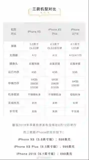 根据知名数码博主@科技新一的爆料显示,三款新iPhone的名称分别为iPhone XS(5.8英寸版)、iPhone XS Plus(6.5英寸版)、iPhone 2018(6.1英寸版),其中,iPhone XS和iPhone XS Plus除尺寸不同外,在外观配置方面基本一致,均配备OLED刘海屏,采用不锈钢机身,搭载全新的A12处理器,配备4GB内存和64/256/512GB存储,配备后置双摄,支持无线快充,支持Apple Pencil。
