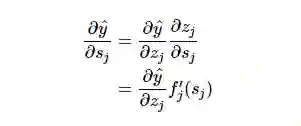 注意最后的偏导项 ∂y^ /∂zj,多神经元取决于 z_j,确切的说是所有 k∈outs(j)的神经元。我们在多个输出端的部分中看到,导致具有多个输出神经元的权重确实对这些输出神经元有影响。但对于每个神经元 k,我们有,每个 s_k 不取决于任何其它同层的结点。因此,我们可以再次使用链式规则并对 k∈out(j)的输出结点求和: